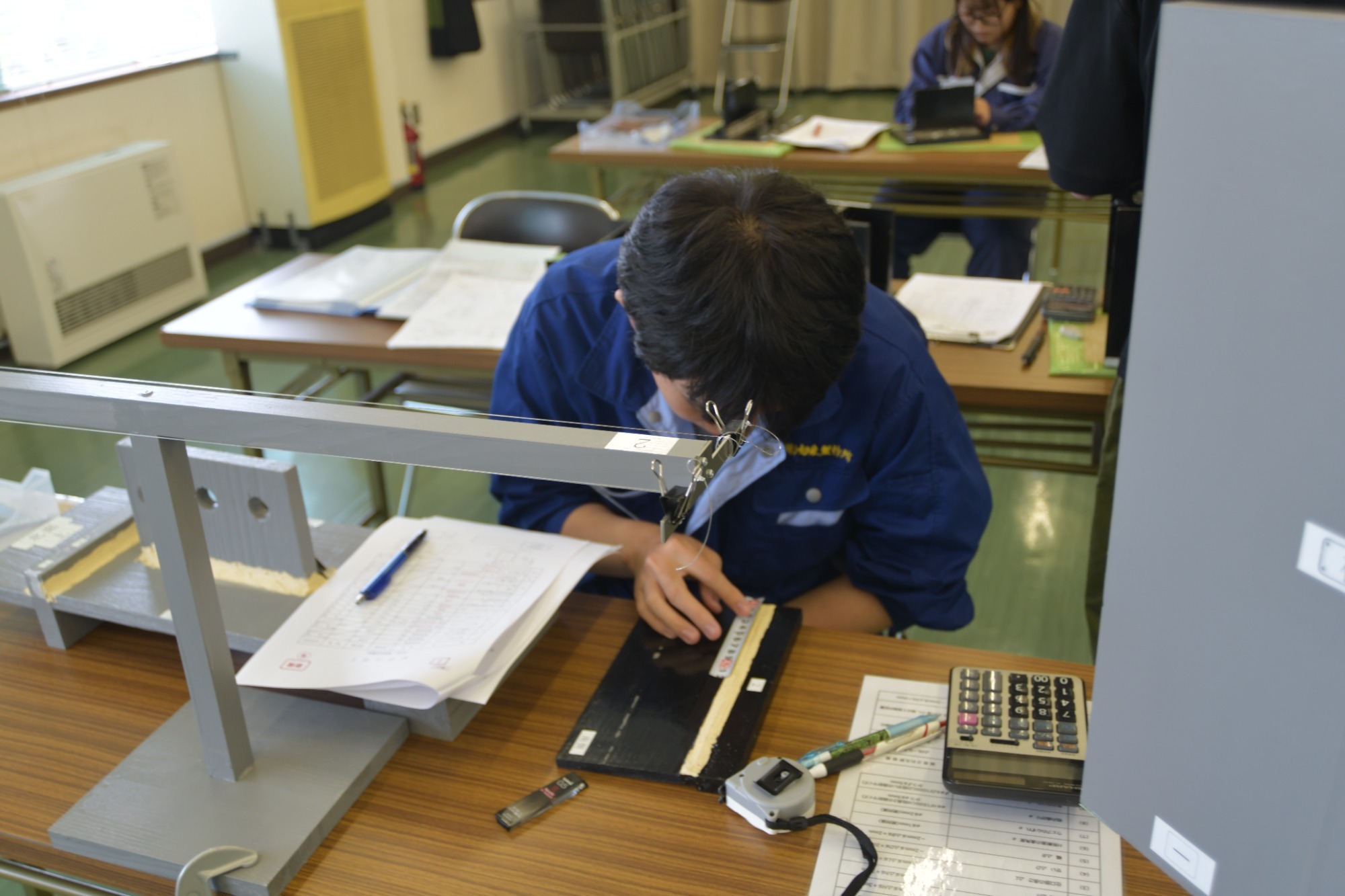 木製柱、鋼製柱、溶接試験体の各部分の測定に係る留意点の説明があったほか、模擬試験で測定ポイントの確認をしました。