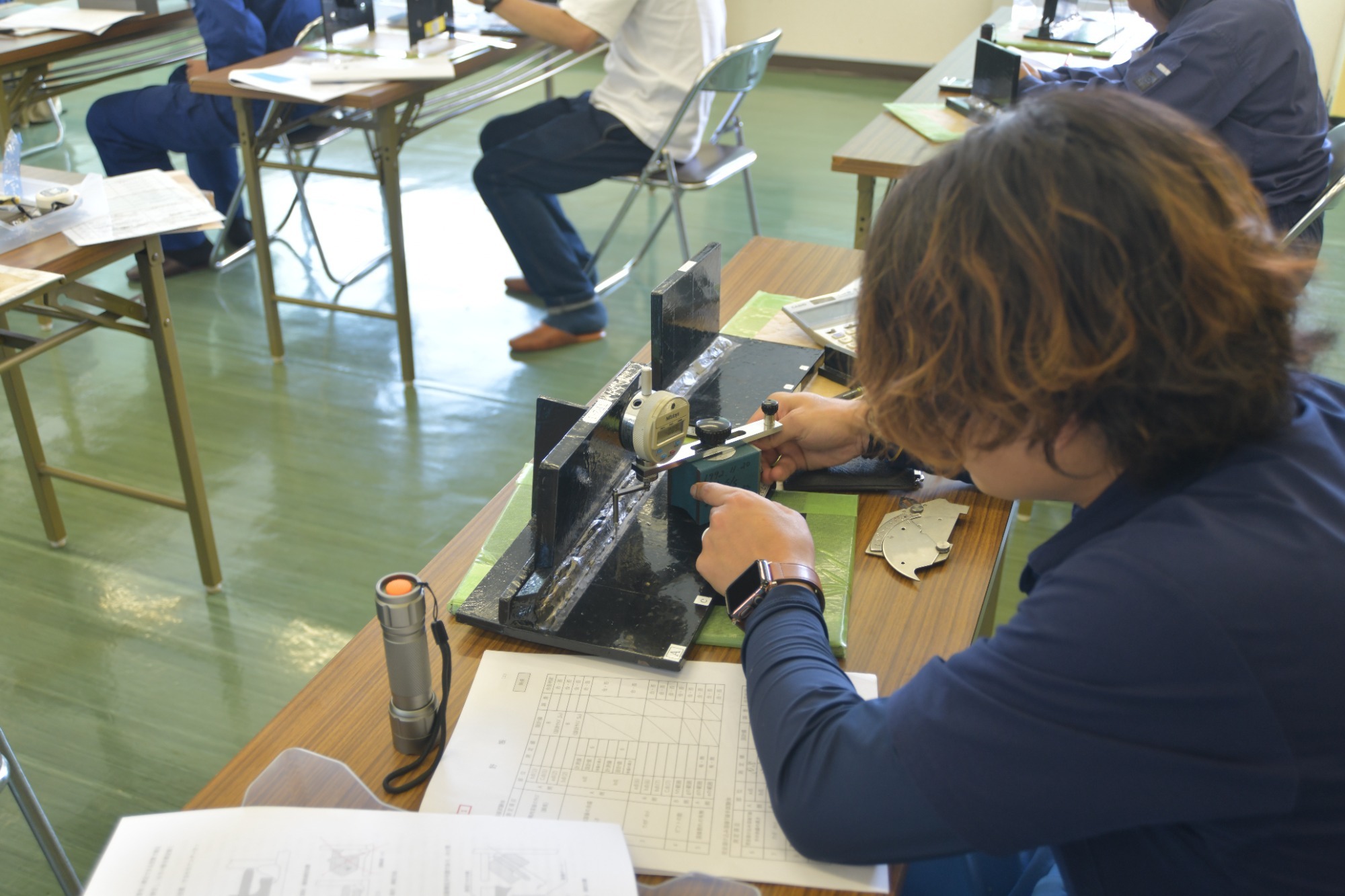 後日盛岡市で行われる同試験の新規・更新受験対策や新入社員等の研修機会として開いたもの。木製柱、鋼製柱、溶接試験体の各部分の測定に係る留意点の説明があったほか、模擬試験で測定ポイントの確認をしました。